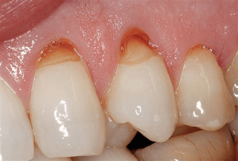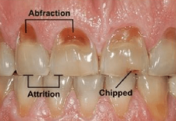 ABFRACTION lesions arises from clenching and is more common in the back (posterior) teeth and the canines but they can occur in the front (anterior) teeth as well. The characteristic appearance is of a straight line break parallel to the occlusal plane near the gumline and it causes the gums to recede. The straight line wedge breakage is a feature of the stress fracture of a hard tooth structure from the bending of the tooth when you gnash them together and move your jaw side to side. Studies have shown that when you do this in your sleep it can be up to 40 times stronger than you could do it when you are awake. You could not do it even if you tried when you are conscious as your higher brain will stop you from doing so. Bruxism is proportional to stress.