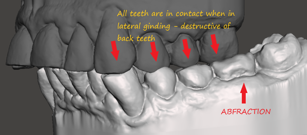 The lost of your canine prominence accelerates the abfraction of the posterior teeth. It is important to reestablish canine disclusion if you have worn down your canines or orthodontically establish it if your bite is not correct.