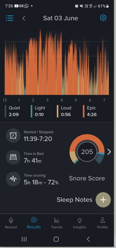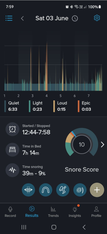 The most important thing that the app achieves is that it give snorers the impetus to do something about it. The reviews on SnoreLab website are inciteful. The following could be your before and after readings. These are actual reading from someone at the beginning of the journey (Left ) and mine (Right) with a decade of monitoring and continual refinements.