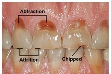 To some degree almost everyone will have evidence of dental attrition and abfraction on some teeth. The degree is dependent on age and inherited personal traits. The attrition or occlusal wear is due to anterotrusive and/or laterotrusive excursion that flattens the occlusal contacts while the abfraction is the clenching forces which fractures the cervical of the tooth due to internal stress from the flex and torsion forces