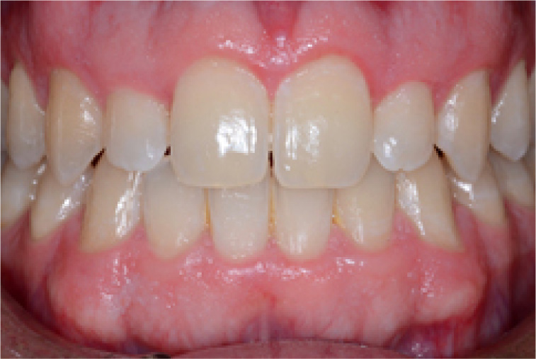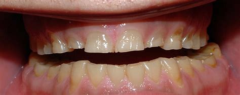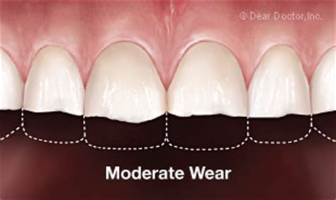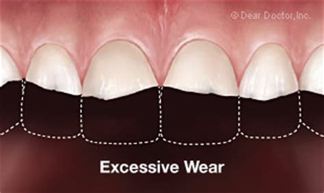 - Severe wearing down of the front teeth. A flat incisal plane from canine to canine. The front teeth are so worn that the canines and central incisal are worn level with the lateral incisors.